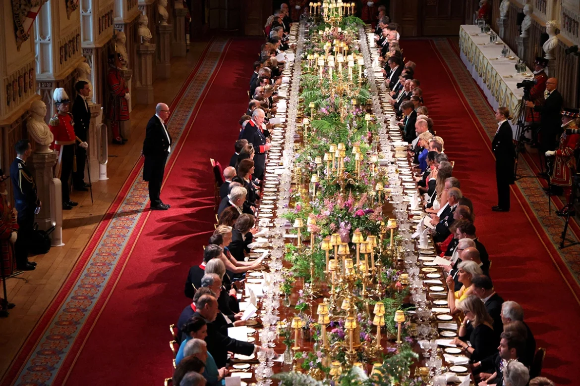 На банкете в честь французского президента присутствовали 160 гостей. В их число вошли члены королевской семьи, а также музыканты Элтон Джон, Мик Джаггер, актриса Кристин Скотт Томас, писатели Джоанн Харрис и Себастьян Фолкс и другие знаменитости.